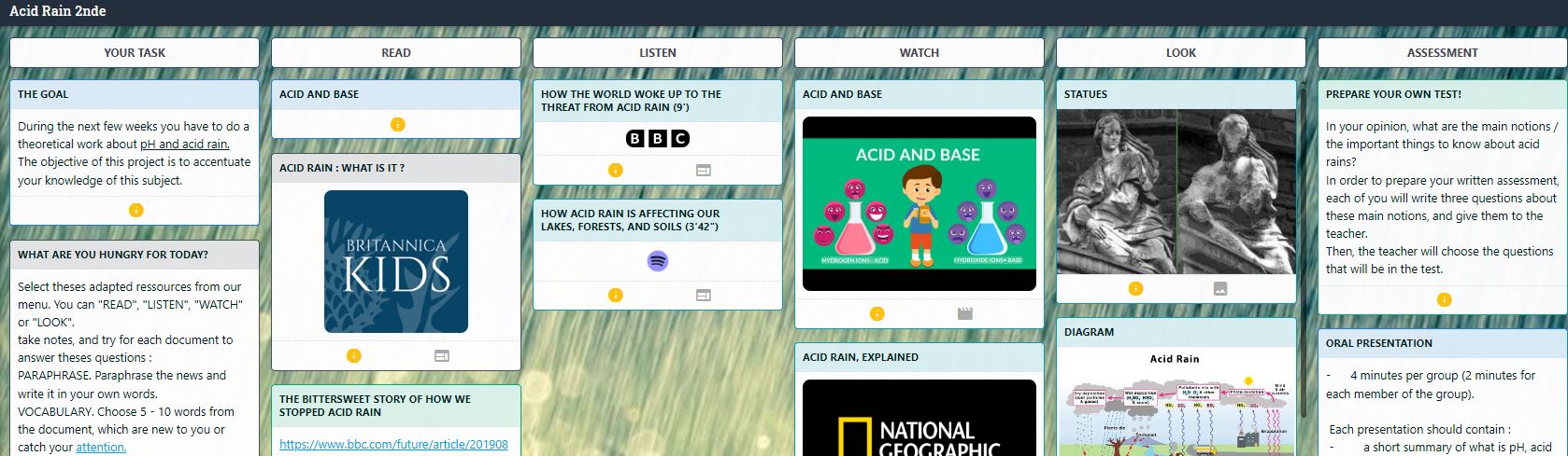 L’activité proposée est une séquence dans laquelle les élèves travaillent sur la thématique des pluies acides. Les notions scientifiques sont acides, bases et pH, notions abordées en collège. Ils ont accès à un DIGIPAD sur « la Digitale » (https://ladigitale.dev/) contenant les ressources. Ils disposent de plusieurs séances pour réaliser l’intégralité du travail proposé avec l’appui de l’enseignant. Le travail se fait par groupes de 2 ou 3 élèves. La finalité du travail est la réalisation d’un oral de 2 minutes par personne. Le passage à l’oral se faisant sans note avec possibilité d’avoir un support visuel de 2 à 3 images à commenter.