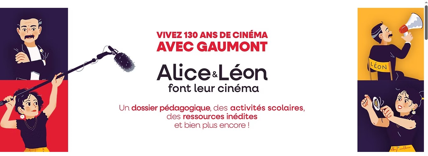À l’occasion des 130 ans du cinéma, le programme « Alice et Léon font leur cinéma », à travers deux figures emblématiques : Alice Guy, première réalisatrice de l’histoire du cinéma en France, et Léon Gaumont, le fondateur de la société éponyme. Plus d’une centaine de pages de ressources pédagogiques sont en accès libre sur le site : www.aliceetleon.com