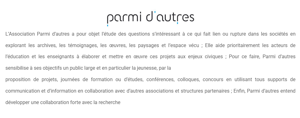 L’association Parmi d’Autres, qui est soutenue par la DILCRAH, la Fondation pour la Mémoire de la Shoah et la Région Haut de France, a pour objet l’étude des questions s’intéressant à ce qui fait lien ou rupture dans les sociétés en explorant les archives, les témoignages, les œuvres, les paysages et l’espace vécu. Elle aide prioritairement les acteurs de l’éducation et les enseignants à élaborer et mettre en œuvre ces projets aux enjeux civiques par un apprentissage actif et engageant des élèves.