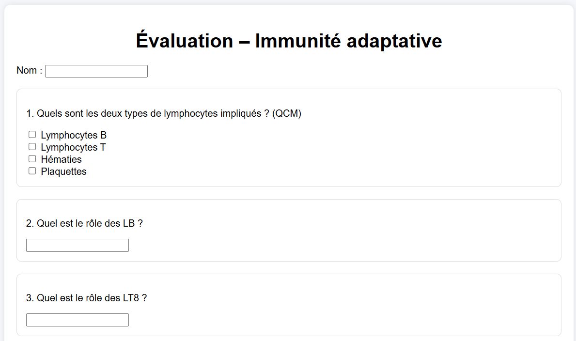 - Prompt : Agis comme un expert en pédagogie, en évaluation et en développement web pour analyser un cours, en extraire les notions essentielles et créer une évaluation interactive auto-corrigée comprenant des questions variées (QCM, réponses courtes et rédigées avec mots-clés) adaptées au niveau du public, avec un barème détaillé et un calcul automatique d’une note sur 20, incluant une correction (exacte ou par mots-clés), l’affichage du score global et du détail par question ainsi qu’un message précisant la limite des corrections ouvertes, puis génère un fichier HTML autonome unique (sans bibliothèque externe, fonctionnant localement et compatible tous supports) intégrant une interface complète (identité, questions, boutons corriger, réinitialiser, télécharger) et permettant de télécharger la page telle quelle via JavaScript, en fournissant directement le code HTML complet prêt à l’emploi sans explication.