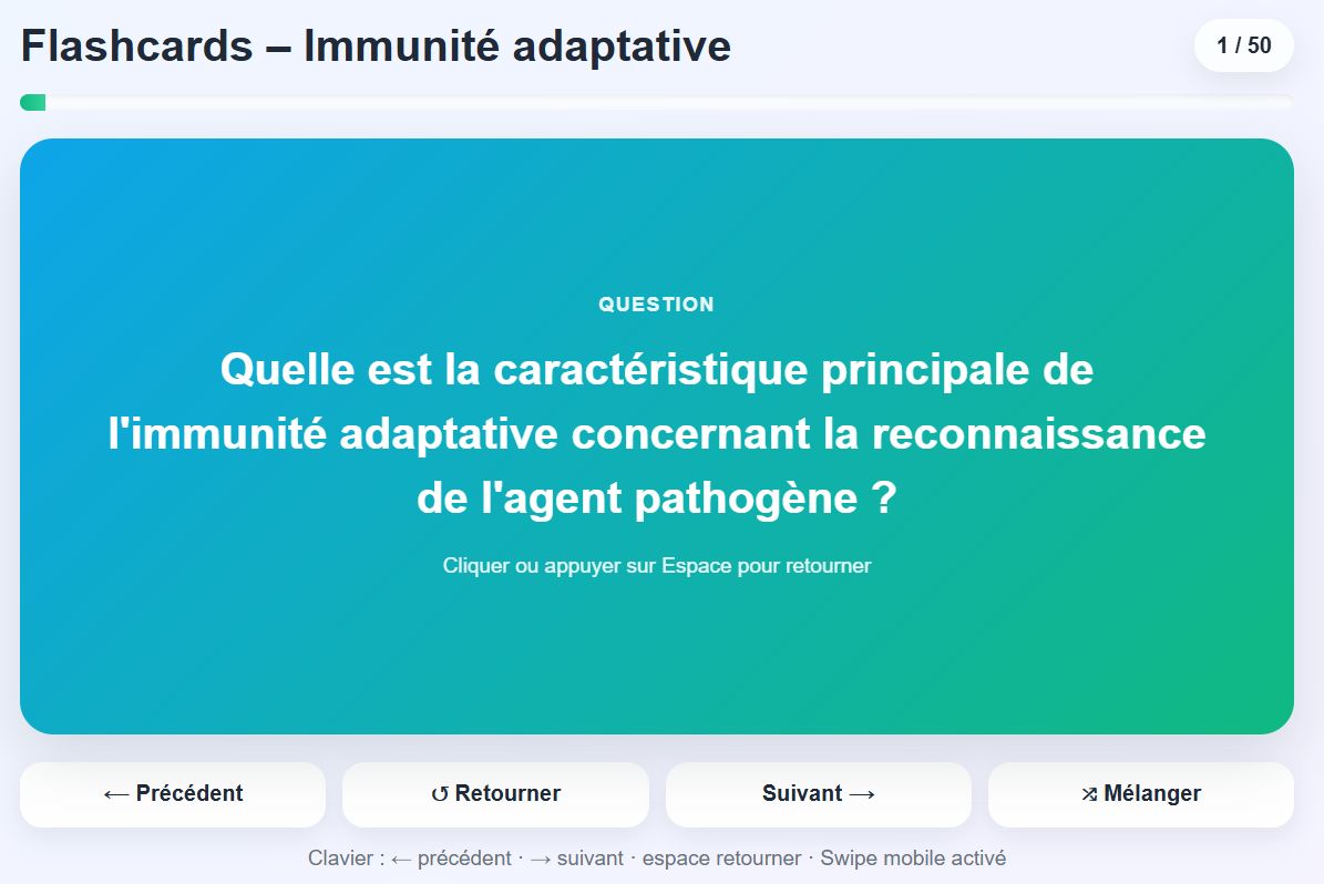 - Prompt : Agis comme un expert en pédagogie et en développement web afin de créer automatiquement des flashcards de révision à partir d’un cours fourni, en extrayant uniquement les notions essentielles (définitions, mécanismes, vocabulaire clé) puis en générant entre 20 et 50 cartes au format ["Question", "Réponse"] avec des questions courtes et claires adaptées au niveau Terminale STL et des réponses précises, concises et scientifiquement exactes ; ensuite, produis un fichier HTML autonome (incluant HTML, CSS et JavaScript sans bibliothèque externe), responsive et immédiatement fonctionnel, permettant d’afficher une carte à la fois avec possibilité de retourner la carte (clic ou bouton), naviguer entre les cartes (précédent, suivant, mélanger), afficher un compteur et une barre de progression, et offrir une navigation clavier (flèches, espace) et tactile (swipe), puis fournis uniquement un lien de téléchargement du fichier HTML sans afficher le code.