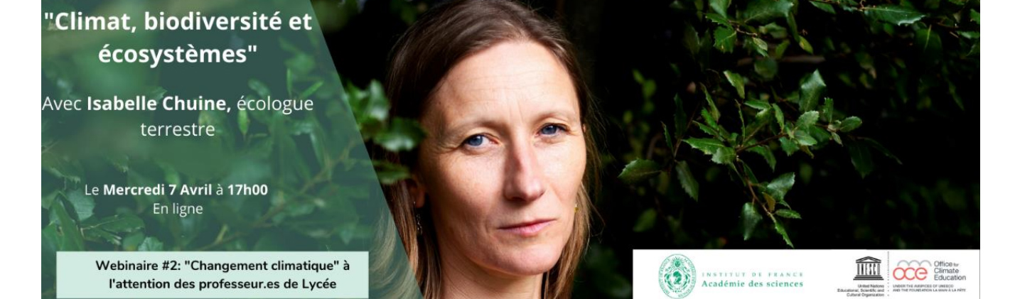 Ce deuxième webinaire aura lieu le mercredi 7 avril prochain (début à 17h00) et aura pour thème Climat, biodiversité et écosystèmes. Il sera assuré par l'écologue terrestre Mme Isabelle Chuine, membre de l'Académie des sciences et directrice de recherche au CNRS exerçant au Centre d'Écologie Fonctionnelle et Évolutive (CEFE) à Montpellier.