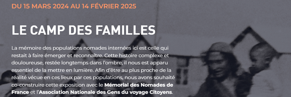 Le Mémorial du Camp de Rivesaltes accueille du 15 mars 2024 au 14 février 2025 l'exposition temporaire « Le Camp des Familles, Persécutions et internement des Nomades à Rivesaltes, 1941-1942 ».