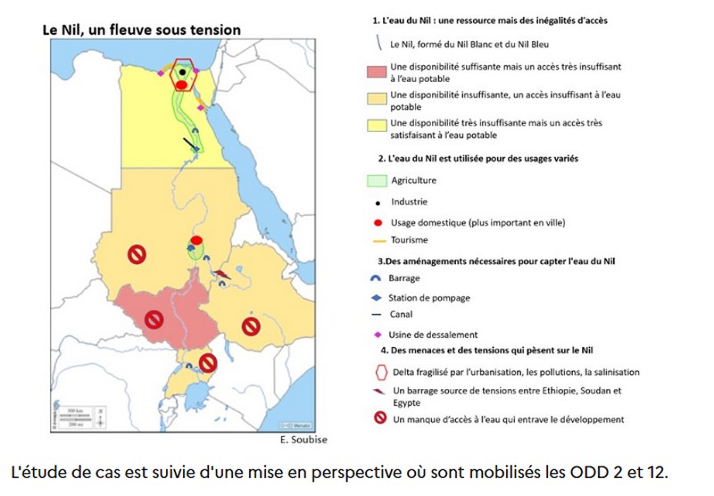 Une étude de cas portant sur le Nil permettant, à partir de deux SIG, de mettre en lumière l'augmentation de la pression sur les eaux du Nil dans un contexte de disponibilité et d'accès variables, de tensions et de fragilités. L'étude de cas conduit à l'élaboration d'un croquis avant une mise en perspective. Les ODD 2 et 12 sont mobilisés.