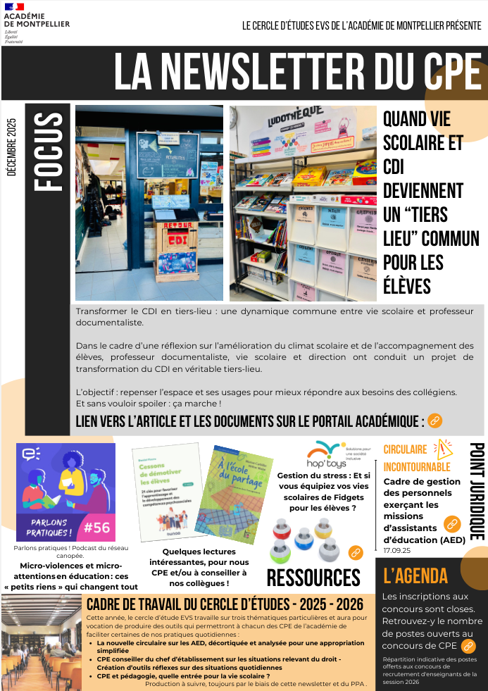 Retrouvez les infos, actus, ressources et idées pour les CPE de l'académie.