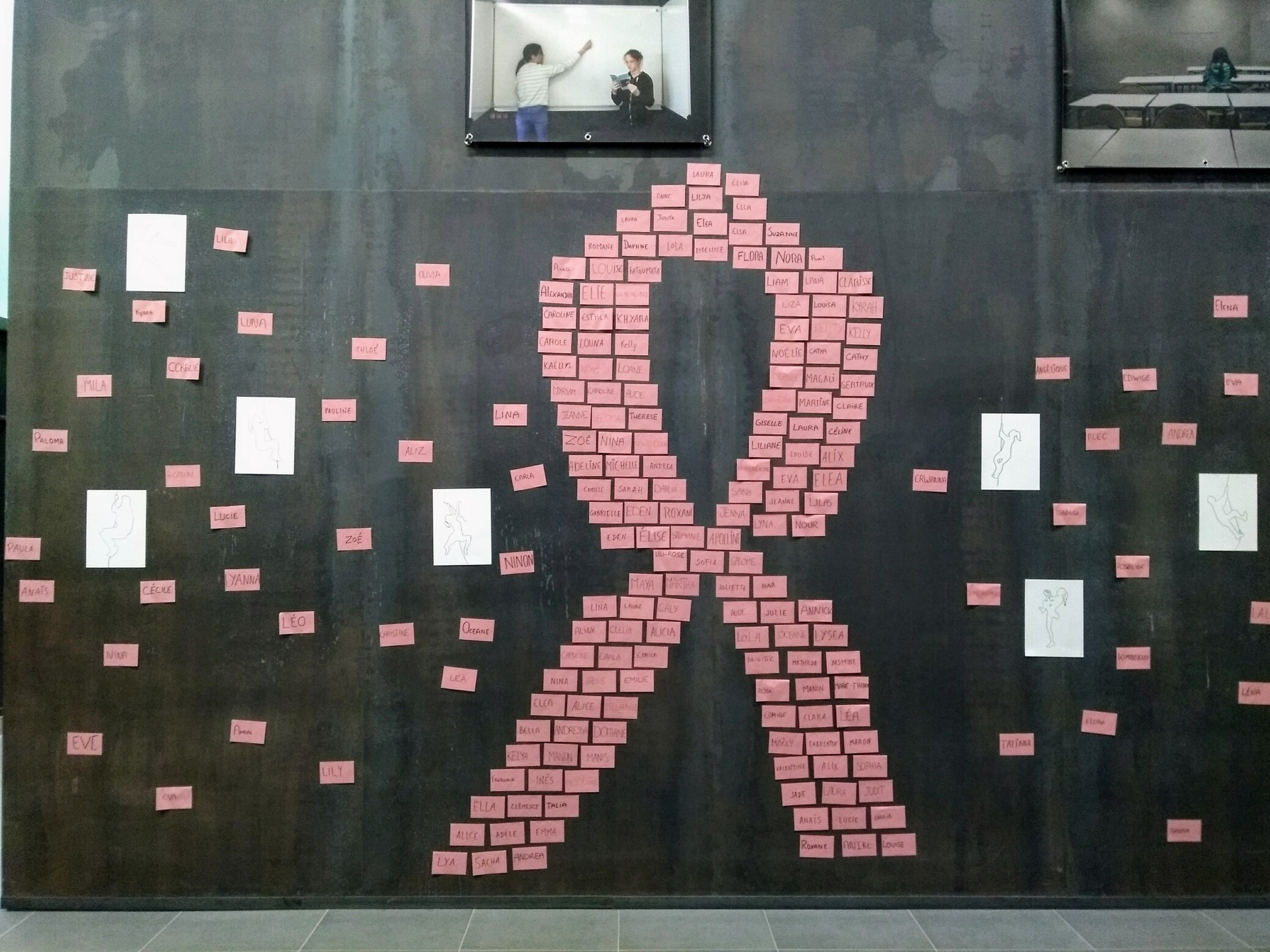 - 20 minutes de réalisation (écrire des prénoms, dessiner des silhouettes) pendant lesquelles les élèves décident de se servir des enveloppes pour dessiner un grand ruban rose face à la porte du CDI, sur une paroie métallique de dimensions imposantes (environ 6m x 2m)