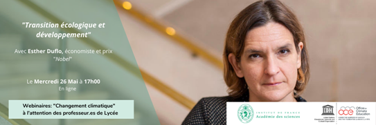 Ce 4e webinaire assuré par Mme Esther Duflo (prix Nobel 2019) aura lieu mercredi 26 mai sur le thème « Transition écologique et développement ».