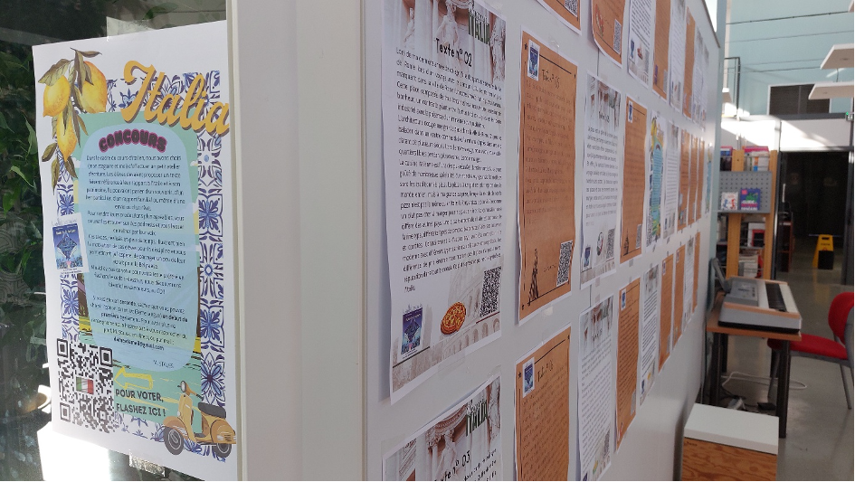 Cet évènement a donné lieu a un travail en classe autour de l’écriture et de la thématique développée dans le lycée à savoir la notion de patrimoine aussi bien culturel, personnel, gastronomique ou autre. Nous avons réalisé un atelier d’écriture avec les secondes LVC et LVB qui ont du partager leurs expériences avec l’Italie. Certains ont évoqué un souvenir marquant, d’autres ont fait part d’un rêve ou d’une envie. Nous avons pu collecter environ 30 textes qui ont ensuite été affichés au CDI. Pour valoriser ces textes, nous avons procédé à un petit concours dont le vote s’est effectué grâce à une application en ligne et un QRcode à scanner. Ainsi, chaque élève venant au CDI, avait la possibilité de voter pour le texte (anonyme bien sûr) qu’il préférait.