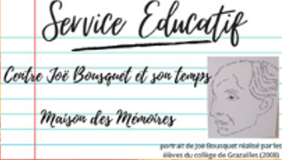 Le Service Educatif apporte une aide aux enseignants dans la réalisation de projets pédagogiques liés aux expositions (permanente et temporaires) du Centre Joe Bousquet et son Temps. Des dossiers pédagogiques, des informations biographiques et bibliographiques sont mis à leur disposition. Des visites organisées autour de questionnaires (réalisés avec les enseignants en fonction de leur projet) sont proposées, ainsi que des ateliers d’Arts Plastiques et/ou d’écriture.