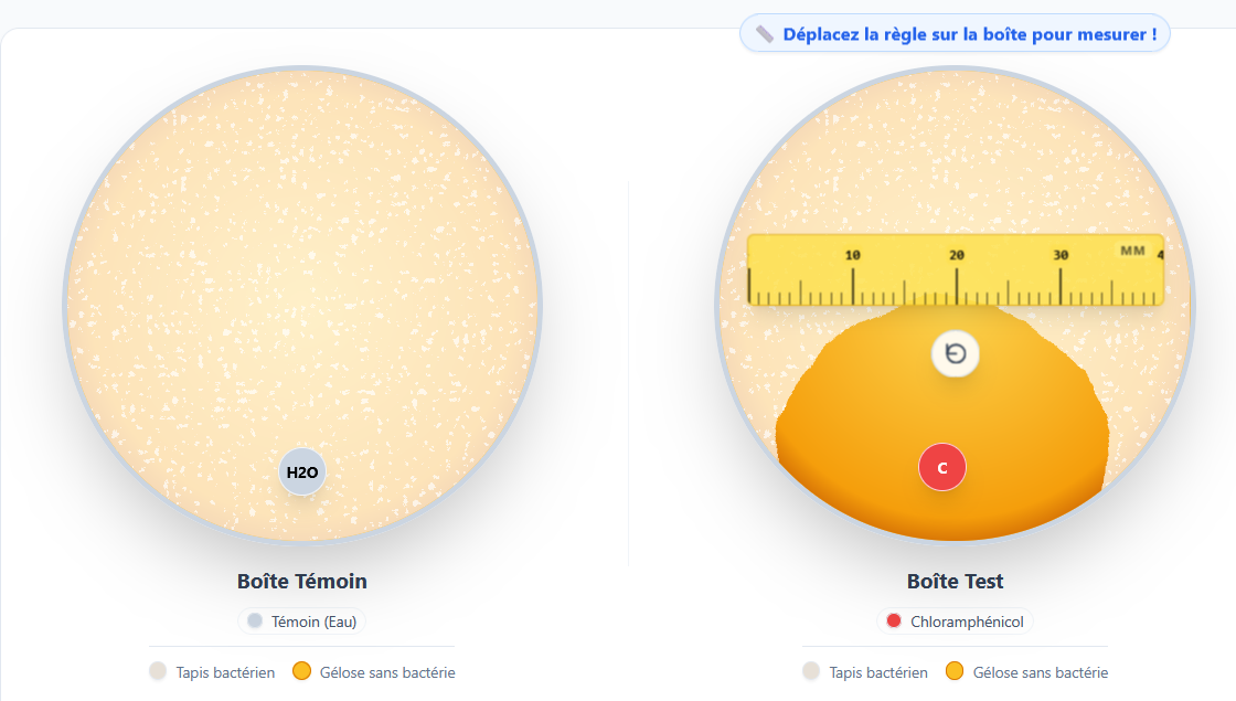 Les élèves ouvrent la simulation et commencent par placer le disque imprégné d'eau (H₂O) sur la boîte Témoin. Après incubation virtuelle de 24h, ils observent la colonisation complète de la boîte : la bactérie se développe normalement. Cette étape consolide la notion de témoin expérimental et de croissance bactérienne. Chaque élève teste successivement les antibiotiques disponibles dans la liste. Pour chaque antibiotique, il place le disque sur la boîte Test, lance l'incubation et note ses résultats sur la fiche papier : présence ou absence d'un halo d'inhibition, taille estimée, conclusion sur la sensibilité ou la résistance de la bactérie.