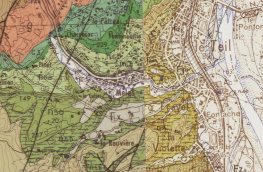 la transition brutale entre le substrat calcaire compact du plateau à l'ouest et les alluvions meubles Fz de la plaine rhodanienne à l'est est une explication possible des dégâts inégaux lors du séisme du Teil — les bâtiments côté plaine alluviale ont subi une amplification significative des ondes.
