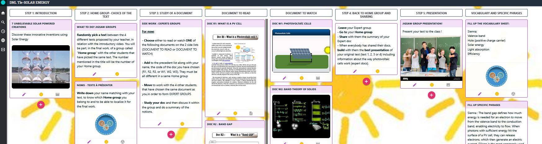 L’activité proposée est une séquence dans laquelle les élèves travaillent sur l'énergie solaire et sa production. Ils ont accès à un mur collaboratif contenant des ressources et disposent de plusieurs séances pour réaliser l’intégralité du travail proposé avec l’appui de l’enseignant. Les élèves devront réaliser un exposé sur un dispositif utilisant l'énergie solaire.
