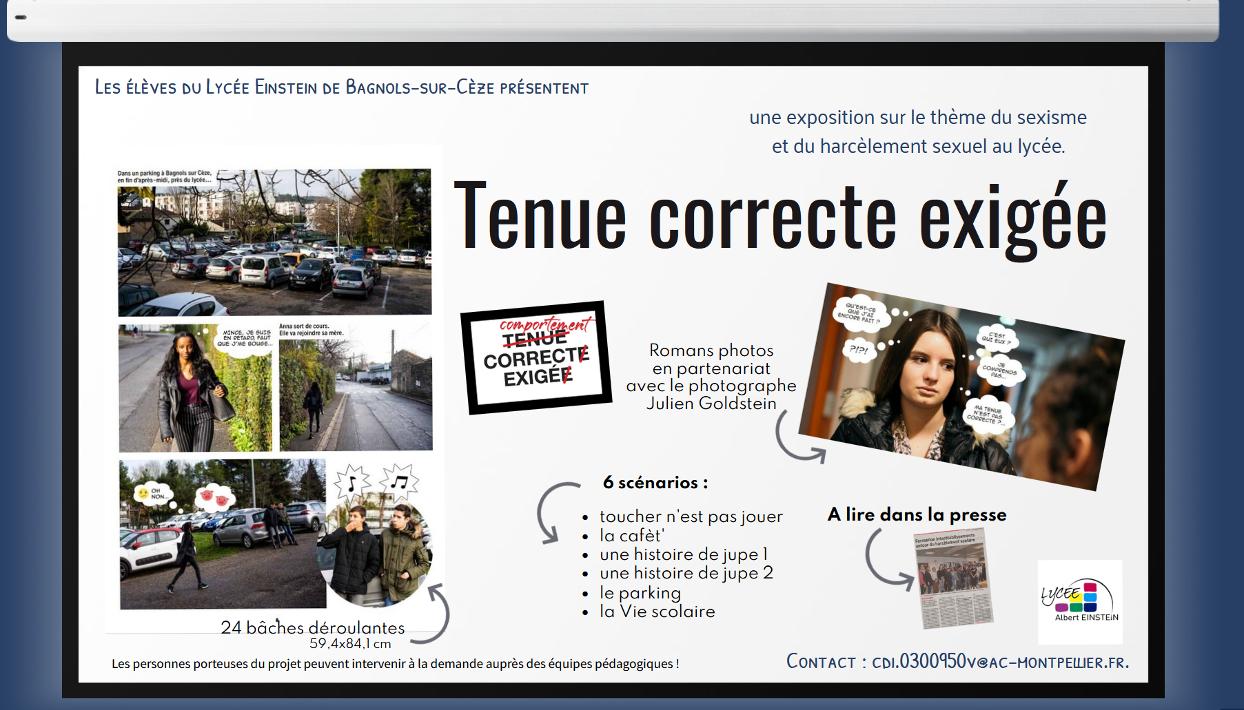 Les élèves du lycée Albert Einstein de Bagnols-sur-Cèze proposent à nouveau cette année le prêt de leur exposition "Tenue correcte exigée", romans-photos reconstituant des scènes d'agressions verbales, sexistes et sexuelles, plutôt à destination des lycéens et élèves de 3ème. Une version numérique est disponible sur demande et les enseignantes porteuses du projet peuvent intervenir auprès des équipes pédagogiques pour expliquer la démarche menée avec les élèves. Cette exposition a été réalisée suite à une résidence dans le lycée du photojournaliste Julien Goldstein.