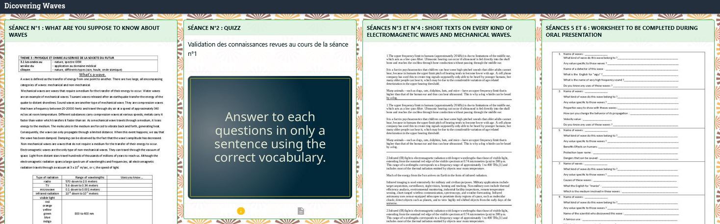 - Comme l’ensemble des ondes et leurs applications ne peuvent être vues par l’ensemble des élèves d’un classe dans le temps imparti, il s’agit que chaque élève puisse se créer une bibliothèque de connaissances sur un thème du programme en s’appuyant sur le travail des autres.